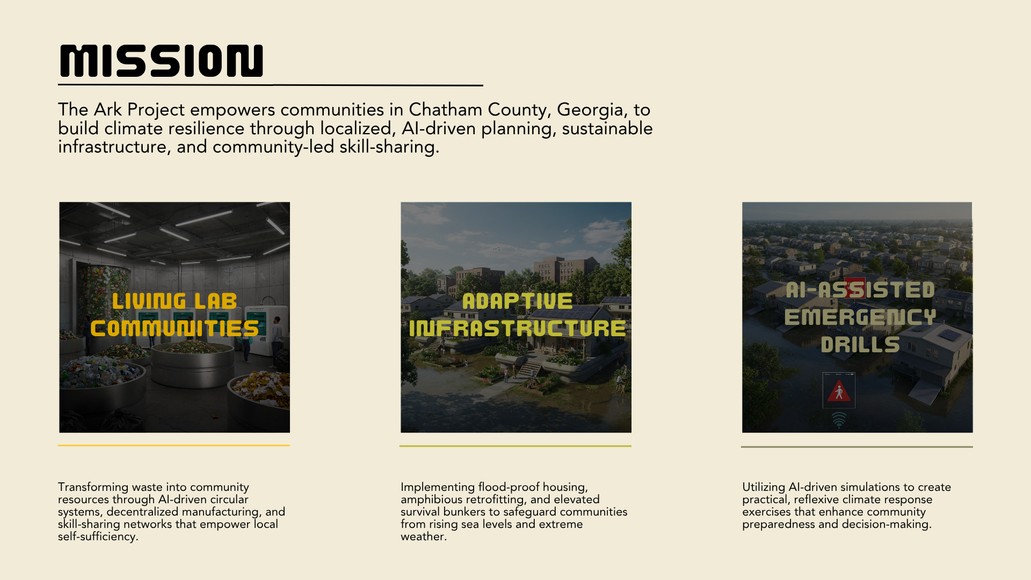 The Ark Project is a speculative yet grounded resilience framework designed to help coastal communities prepare for escalating climate threats by transforming neighborhoods into self-sufficient, adaptive ecosystems.